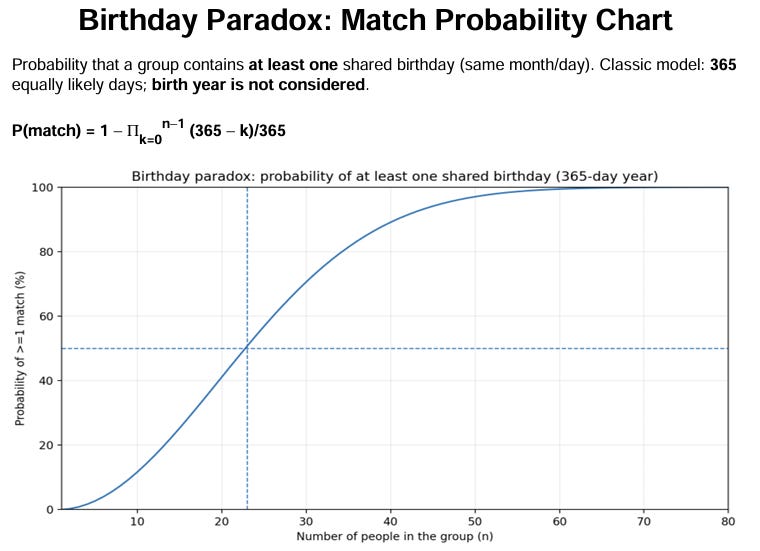 That’s why you get the famous result: with 23 people, there’s already about a 50% chance that two share the same birthday (same month/day).